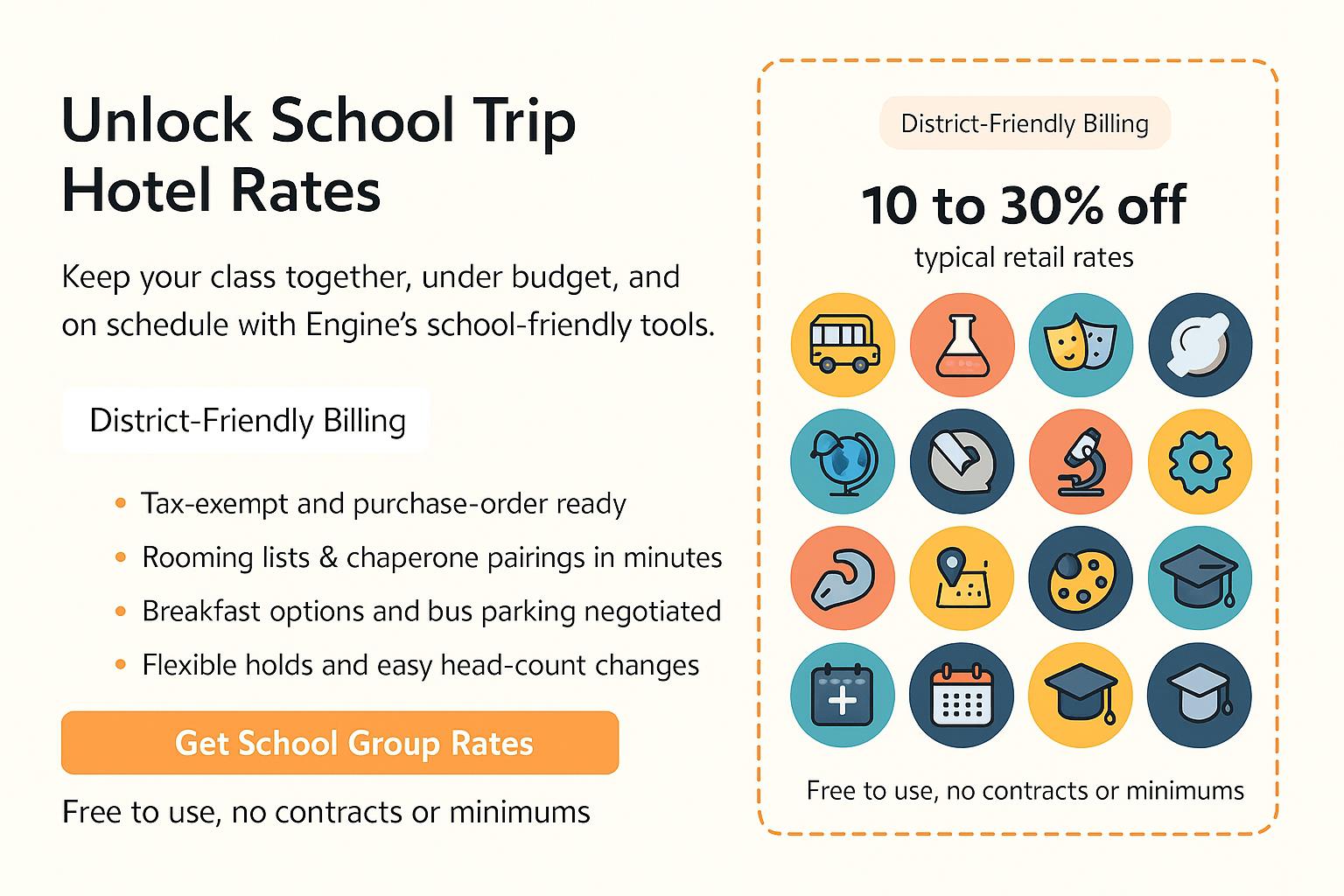 Engine streamlines group hotel booking for school trips and class trips. Enter dates, headcount, and room mix, and our RFP tool gathers quotes from vetted hotels so you can compare options and pick the best value. We negotiate discounted group rates, secure room blocks, and handle requests like bus parking, breakfast, and late check-ins. Direct Bill, consolidated invoicing, Flex change protection, and a simple dashboard keep teachers, administrators, and coaches organized while 24/7 support helps you save time and money.