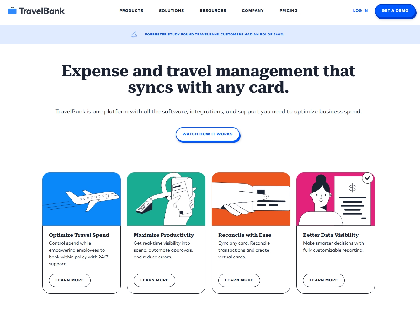 Overview Now a U.S. Bank company, TravelBank is a fintech-forward travel and expense management platform. It is particularly popular with small to mid-sized businesses (SMBs) because of its lightweight, mobile-first design. The platform sets itself apart by gamifying the budgeting process to encourage employees to save money.