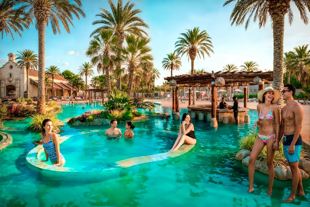 - A wellness zone with thermal springs, spa treatments, an adults only “Baby Beach” pool area, and a broader beach club concept