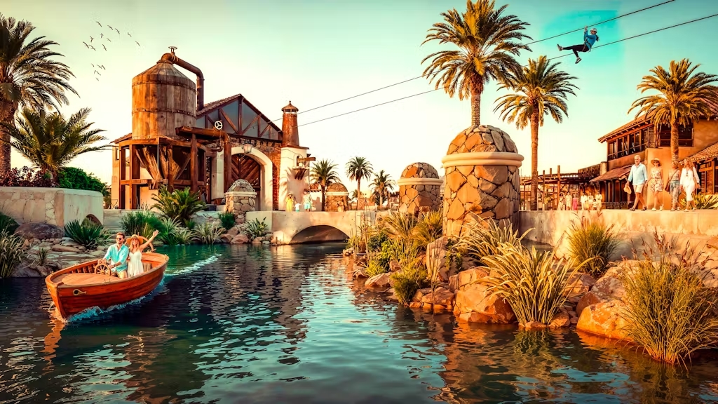 - High energy attractions such as zip lines, river style rides, a scenic boat ride, and a signature off road dune rally experience