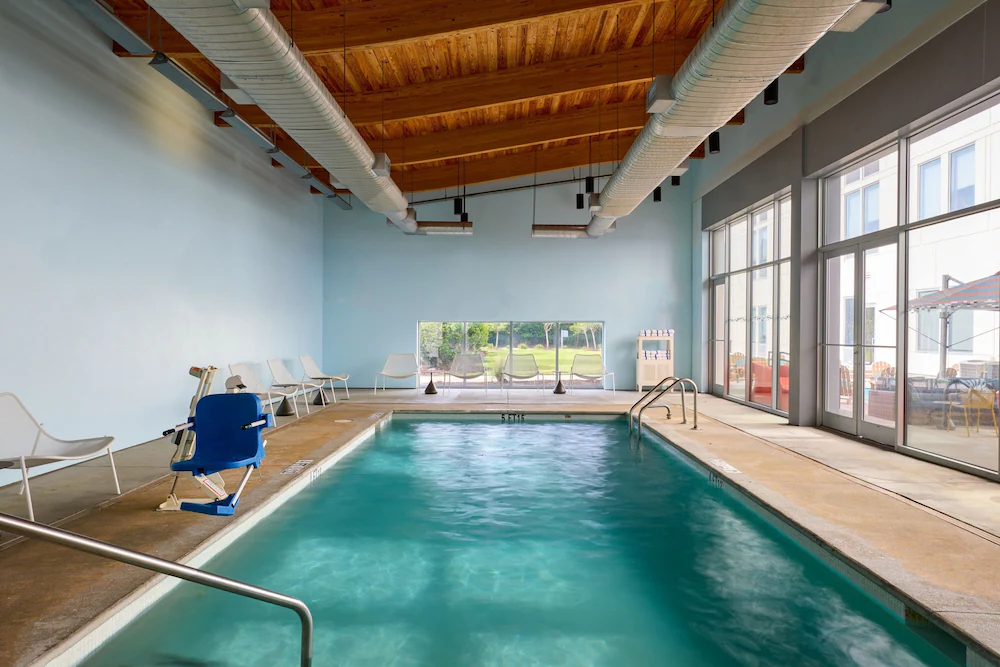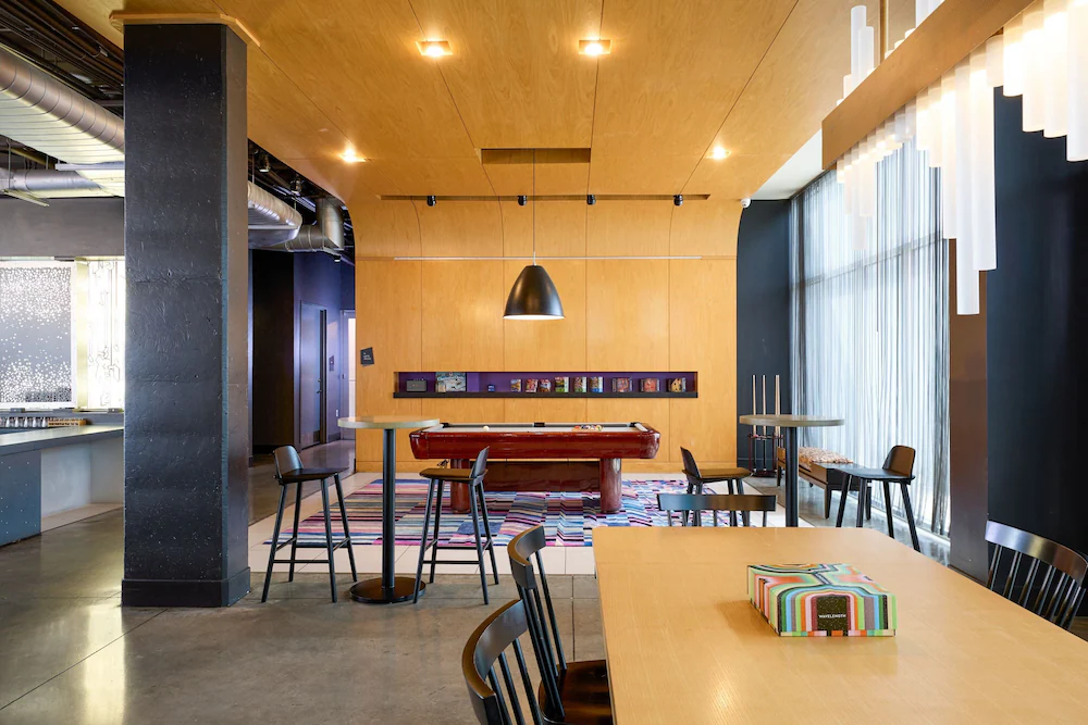 In the hotel itself, Aloft usually leans modern and functional, with common areas that feel more like a casual hangout than a formal lobby. That setup works well when a project team needs a place to regroup, knock out quick laptop work, or coordinate the next day without crowding into one room. Rooms are typically set up for short-to-medium stays, with practical storage, workspace, and an easy in-and-out flow.