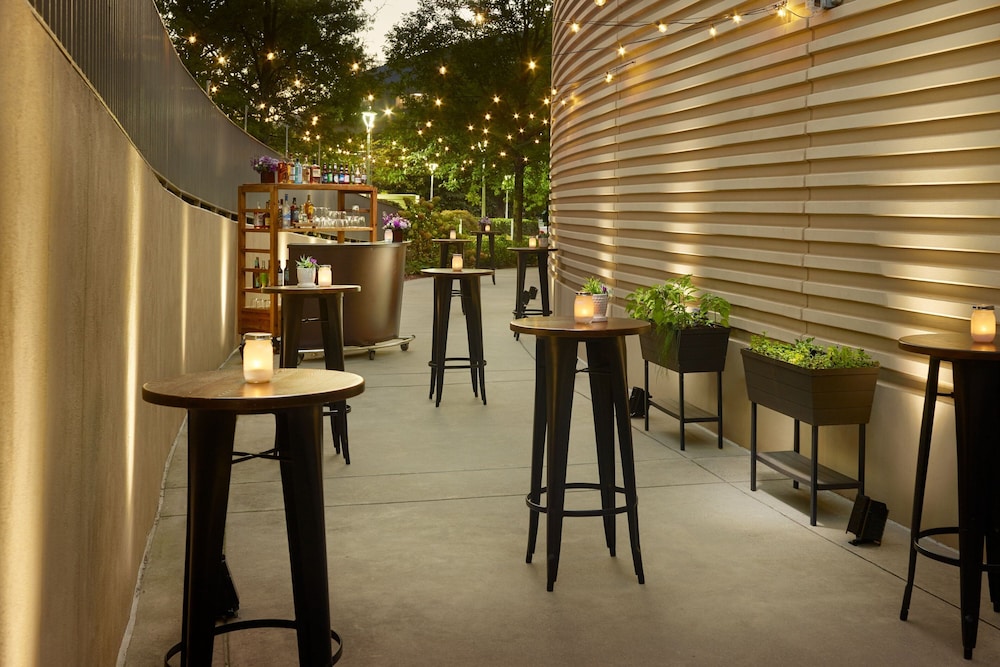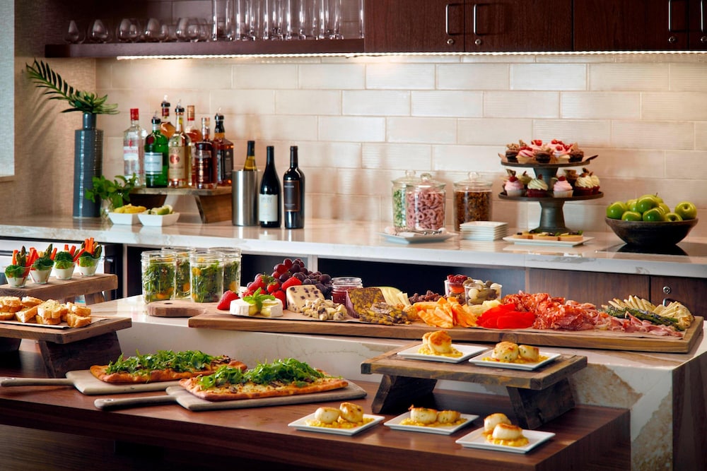 The hotel carries the full Marriott amenity package that frequent travelers expect. The fitness center is well-equipped for guests keeping up with workout routines during longer stays. The outdoor pool gives leisure travelers and groups a place to decompress between sessions. Dining options on-site cover breakfast through evening meals, and the bar is a natural gathering point for groups wrapping up a long day of meetings or travel. Parking is available for guests arriving by car, which matters for groups driving in from across the metro area.