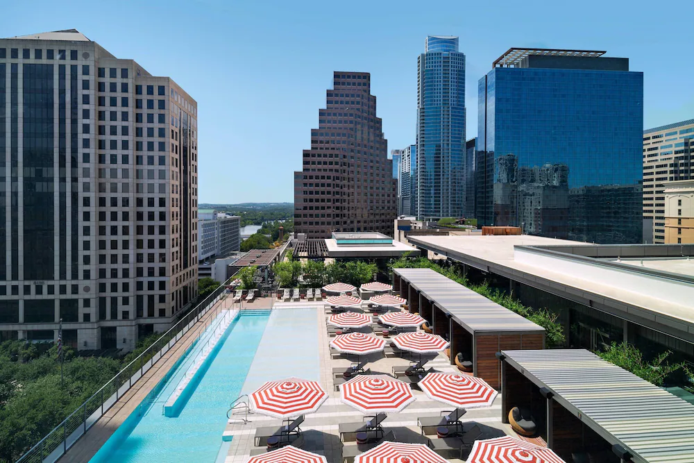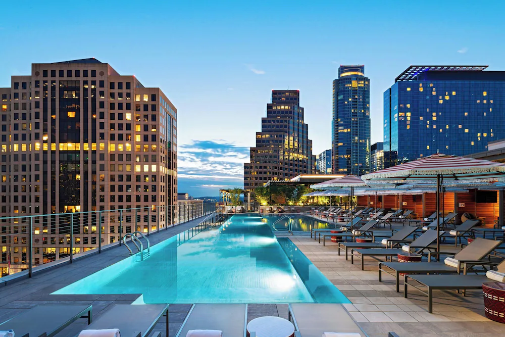 Rooftop pool deck with skyline views for welcome receptions, VIP hours, and private concerts, with simple indoor weather backups