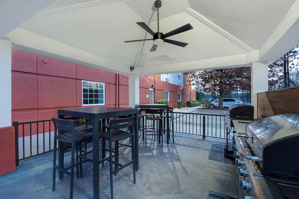 Candlewood’s daily rhythm saves time. The 24-hour Candlewood Cupboard stocks heat-and-eat meals, snacks, drinks, and forgotten essentials, which is helpful when you return late from the range. Complimentary self-service laundry lets you run a midweek wash without hunting for coins. The Lending Locker is a signature perk, offering small appliances and household items to borrow, such as a blender, rice cooker, or extra cookware, so your kitchen can handle more than microwave meals. A fitness room covers treadmill and bike sessions along with light strength work. Outdoors, the covered gazebo area with grills makes quick dinners practical when you would rather stay on property.