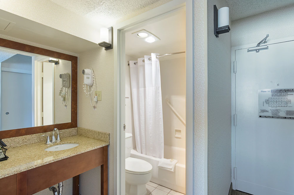 Rooms are designed around simple comfort and quick resets between city stops. Refrigerators are standard, Wi-Fi is included, and some categories emphasize bay-facing views that make the stay feel more connected to the water than you’d expect from a city hotel. Interior corridors and elevator access keep the layout easy to navigate when you’re moving people in and out on different schedules, and the overall footprint feels geared toward short stays and long weekends rather than extended, in-room living.