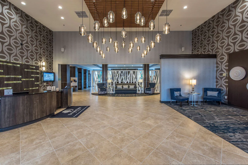 Inside, the layout tends to match what crews and coordinators want during a multi-day run: a straightforward check-in, common areas that can handle people coming and going, and guest rooms that feel consistent from floor to floor. The building functions well when multiple arrivals land at different times, or when a team needs to split between early sleepers and late-night planners. A convention-focused DoubleTree is usually designed to absorb that traffic without turning the lobby into a bottleneck.