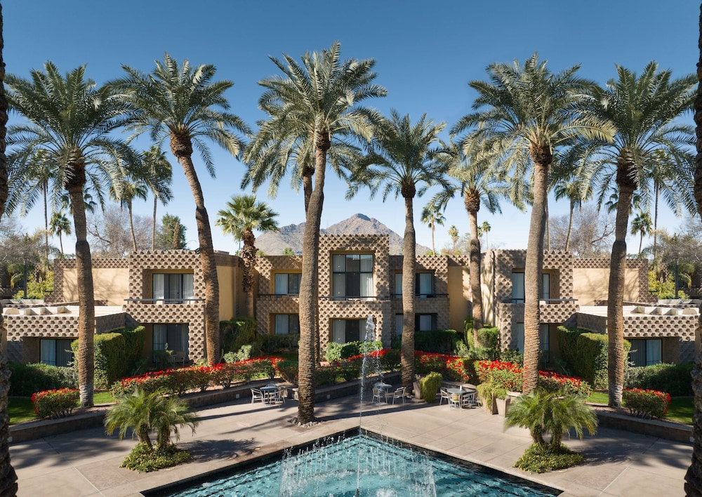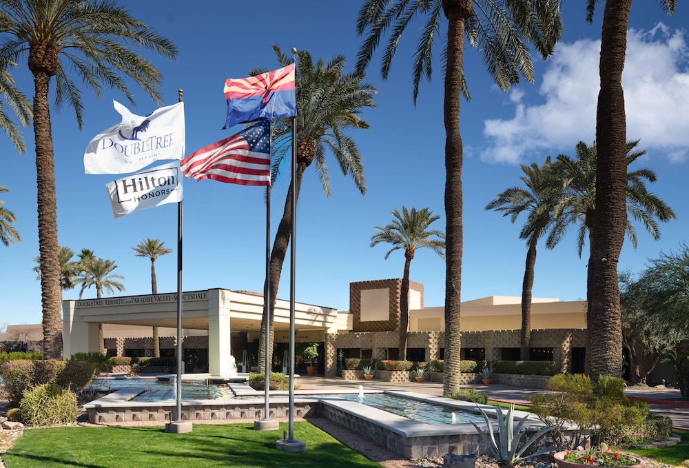 The DoubleTree Resort by Hilton Paradise Valley sits on 22 acres in the heart of Scottsdale, offering 478 guest rooms alongside a full-service spa, two outdoor pools, a 9-hole putting green, and architecture designed by students of Frank Lloyd Wright.