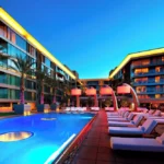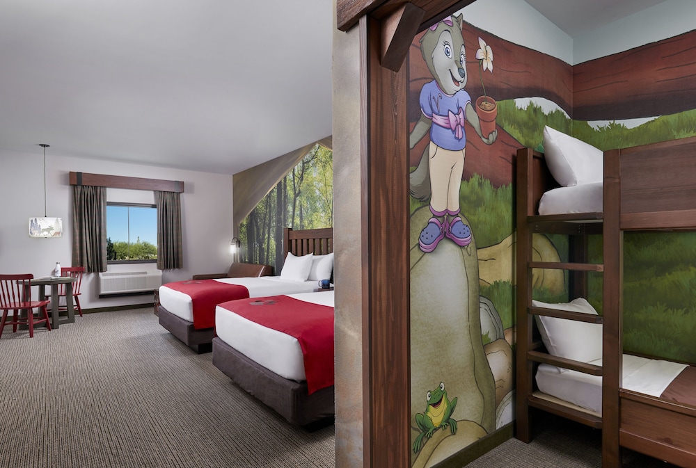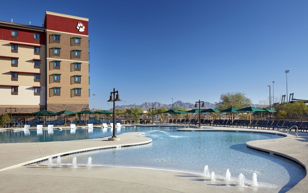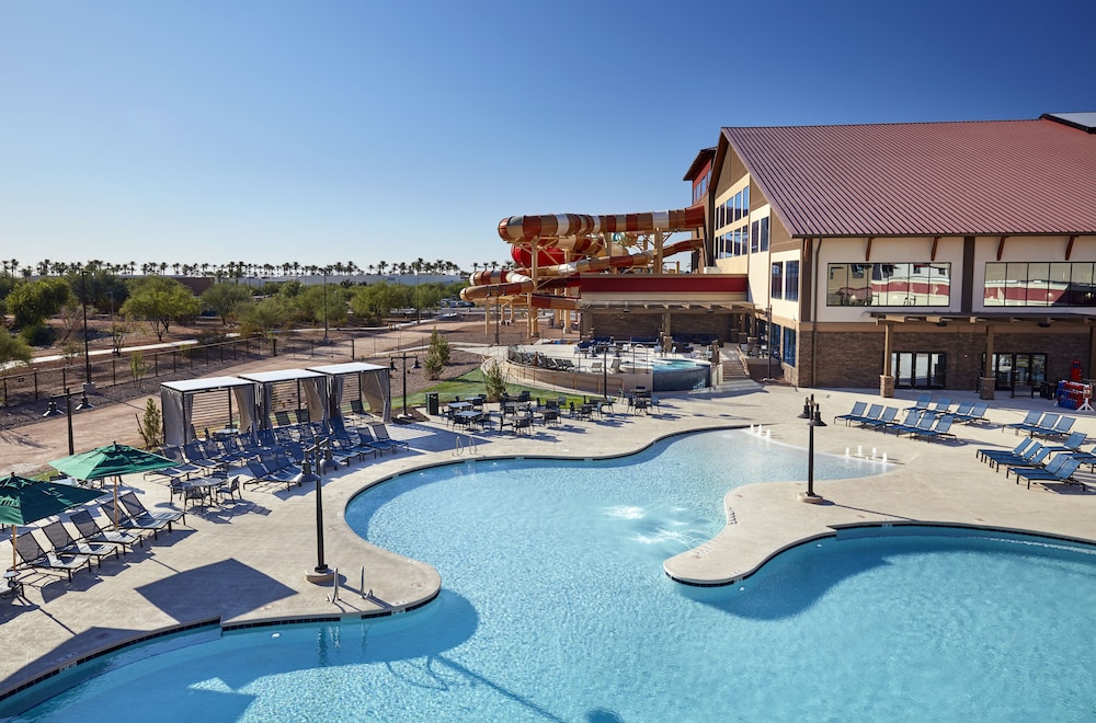 Great Wolf Lodge Arizona sits in the Talking Stick Entertainment District in Scottsdale with 350 all-suite rooms spread across six floors. The property opened in September 2019 and centers on an 85,000-square-foot indoor water park kept at 84 degrees year-round, including the Diamondback Drop water ride and a wave pool, lazy river, and multiple slides. A 27,000-square-foot family entertainment center called Great Wolf Adventure Park adds dry-land attractions including a rock climbing wall, 3-story ropes course, mini bowling, mini golf, and MagiQuest. The lobby features a first-of-its-kind animated show using projection mapping technology across moving and three-dimensional surfaces.