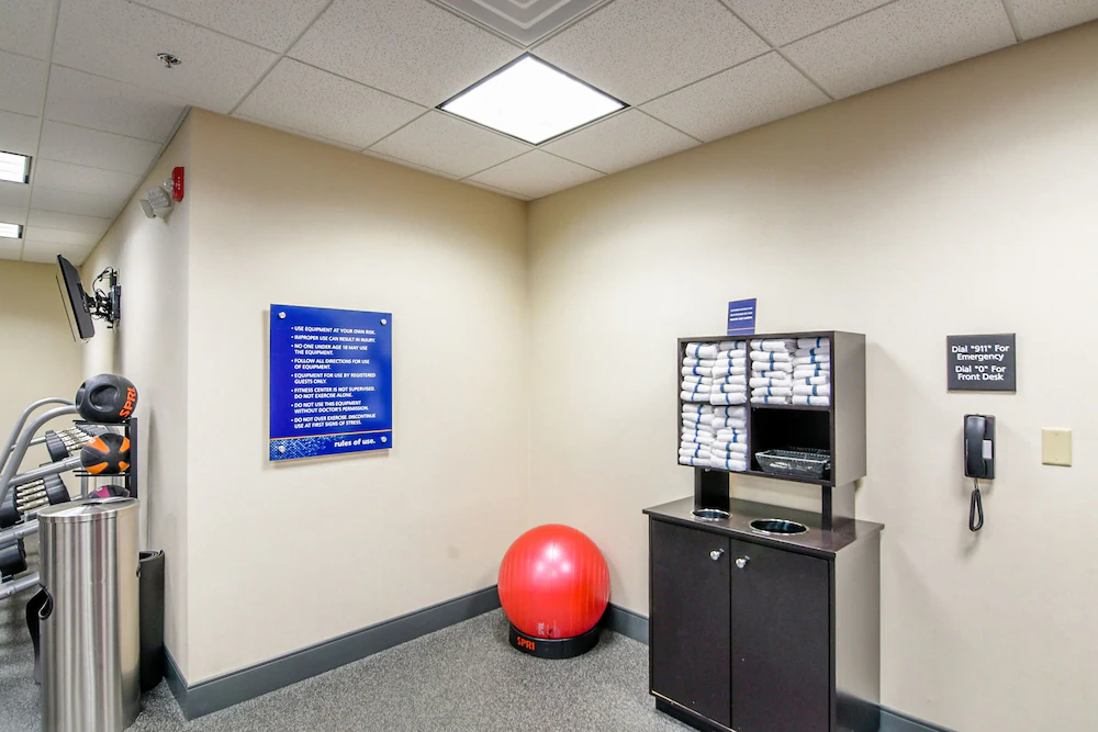 Recovery is handled in a low-effort way. An outdoor pool gives players and families an easy downtime option after games, and the fitness room supports stretching, light workouts, and warmup routines. A meeting room adds flexibility for a quick coach talk, a check-in point, or a short parent meeting without trying to take over the breakfast area.