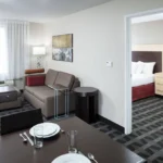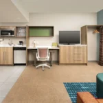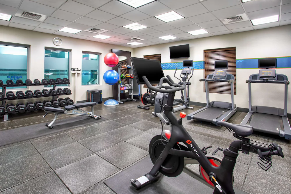The daily routine is straightforward. The complimentary breakfast covers hot and cold items along with coffee that is ready early, so you can leave on schedule. A lobby market stocks drinks, snacks, and simple microwaveable options for nights when you prefer to stay on property. The fitness room supports treadmill and bike sessions with space for light strength work, and a hotel pool offers a cooldown when you need a quick reset. The business center covers printing and quick computer use, useful for last-minute paperwork. Self-parking is on site, keeping arrivals and departures easy if you are rotating teammates through the week.