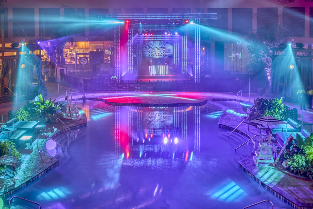 Indoor glass-domed pool area available for private evening buyouts and receptions