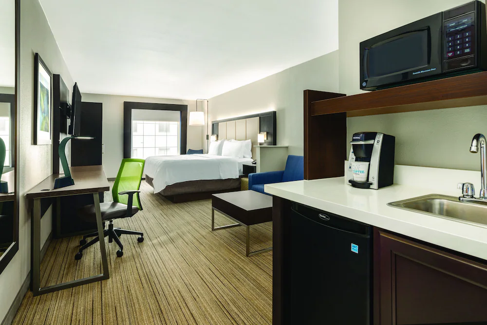 This hotel is built for convenience, especially for longer stays. Each suite is equipped with a mini-fridge, microwave, and a work area, giving you the flexibility to work and snack on your own schedule. The on site laundry facilities mean you can pack light and always have fresh clothes ready. Plus, with a 24 hour “Sweet Shop,” you can grab a drink, snack, or frozen meal whenever a craving strikes.