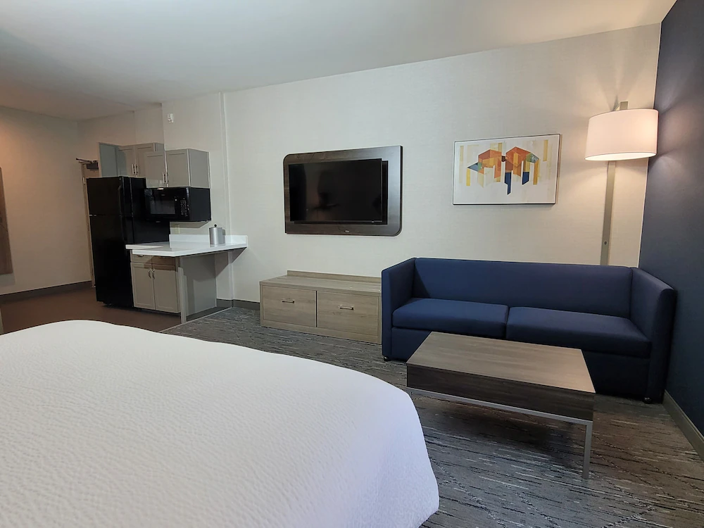 Guest rooms are engineered for productivity and rest, featuring a consistent layout that maximizes available square footage. Each room includes a dedicated workspace with an ergonomic chair and conveniently placed power outlets, catering to the needs of corporate travelers. The integration of a mini-fridge, microwave, and Keurig coffee maker into every unit ensures that guests can manage their own schedules and meals. For those requiring more space, the suites offer kitchenettes and separate living areas with sofa beds, which are ideal for room-sharing arrangements among group members. The color palette is neutral and professional, complemented by blackout drapes that ensure a quiet environment regardless of the time of day.