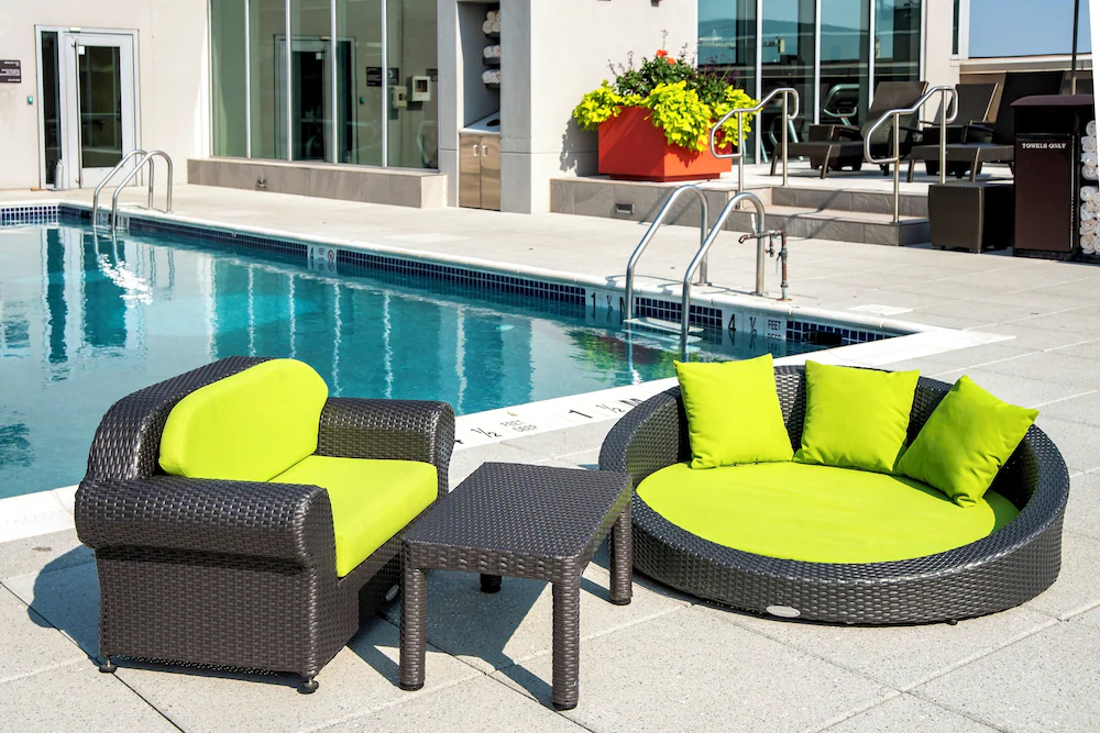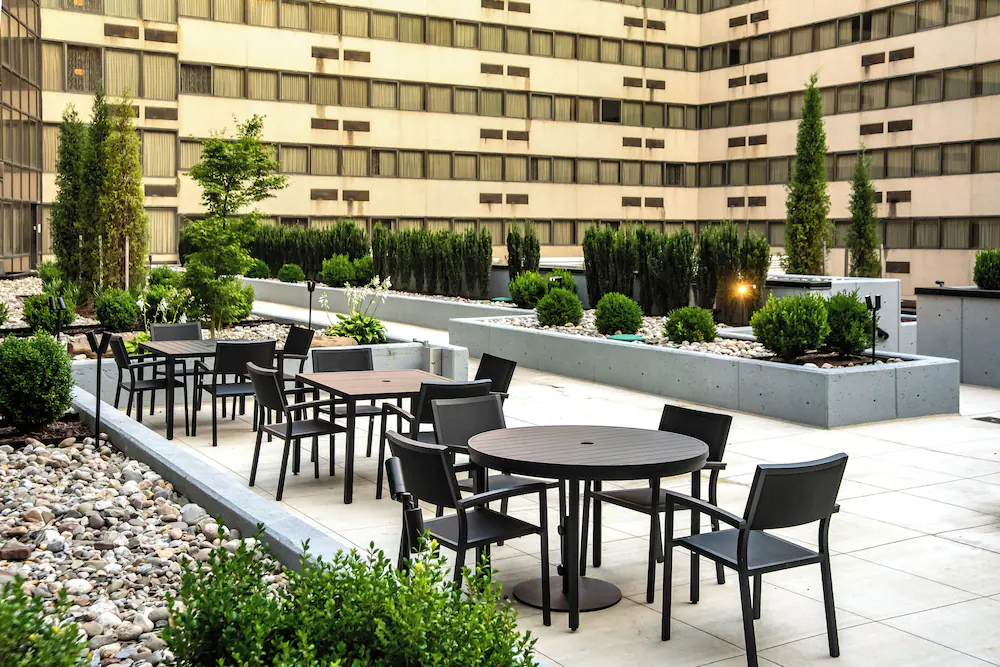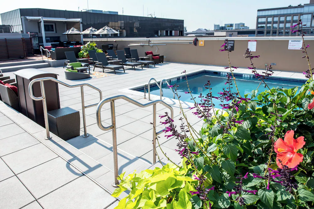 On-site parking, on-site dining, free Wi-Fi, fitness center, and seasonal rooftop pool