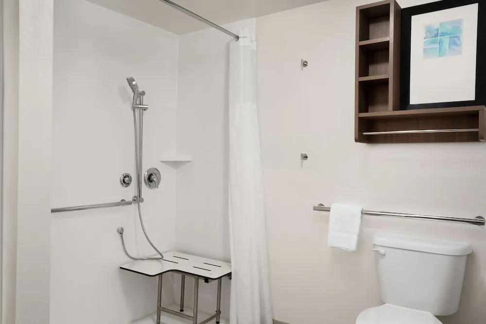 Accommodations at the hotel are available in studio and one-bedroom suite configurations. Each suite is laid out with distinct zones for living, working, and sleeping. The one-bedroom options feature a separate bedroom with a door that closes off from the main living area. All suites include a sleeper sofa in the living room and a fully equipped kitchen, allowing for in-room meal preparation and storage.