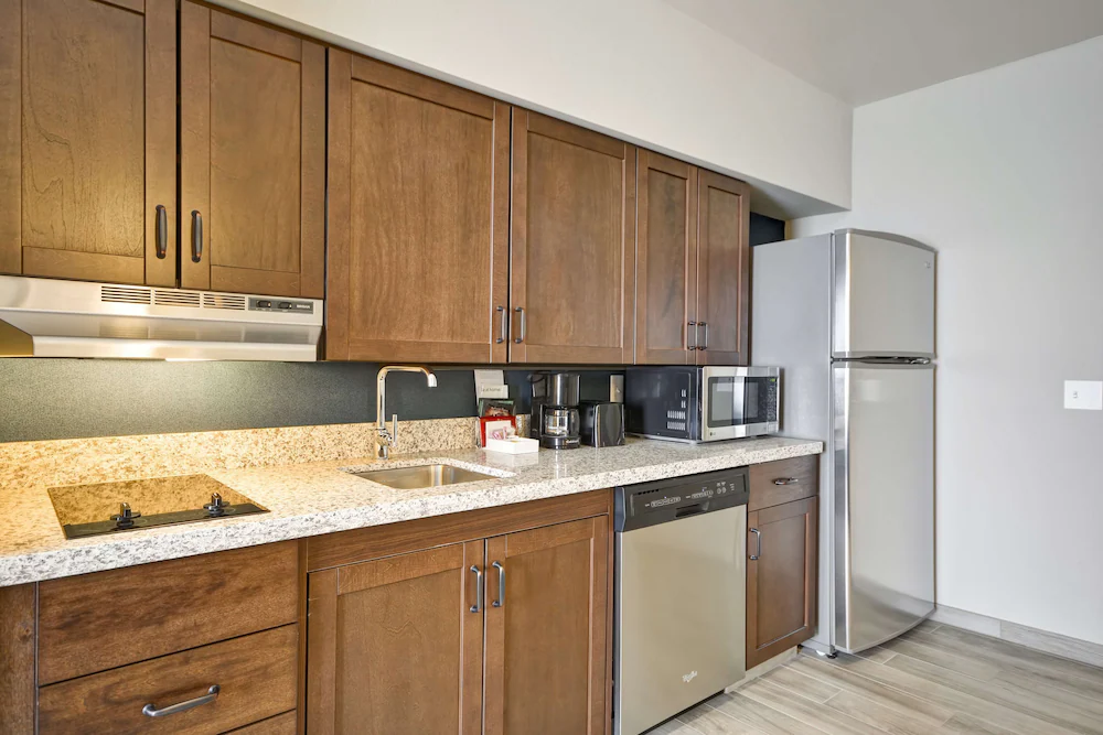 Every suite comes with a full kitchen, so you can stock groceries and cook like home instead of relying on restaurants. Expect a real refrigerator and freezer, a two-burner cooktop, microwave, dishwasher, cookware, plates, and utensils. Separate living and sleeping areas make it easier to keep a steady schedule, especially if you are sharing space with a colleague or family. Desks, reliable Wi-Fi, and plenty of outlets keep laptops and gear powered for late study sessions or remote work. Many suites include a sleeper sofa for added flexibility.