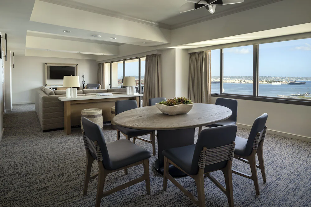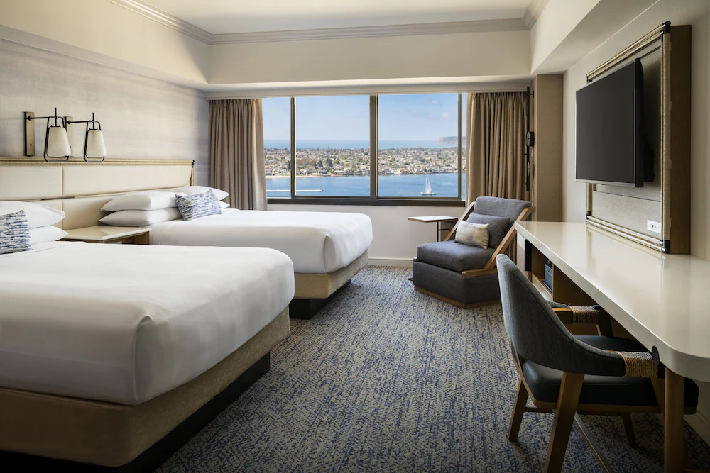 Anchored on the waterfront next to the marina, Marriott Marquis San Diego Marina is a large, two-tower hotel built to handle high-volume arrivals, big agendas, and multi-day stays without feeling cramped. The layout is straightforward: a central core connects guest elevators, lobby services, and the meeting floors, with clear circulation that makes it easy to move a group from check-in to sessions to meals without constant wayfinding.