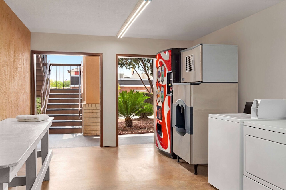 Your daily routine stays simple. Complimentary breakfast gets you out the door quickly, with coffee ready early. A small lobby market or vending area covers basic grabs when you need a drink or snack on the way out. Housekeeping follows a cadence that works for extended timelines, with towel exchange and room refreshes available without daily interruptions. Guest laundry helps you lock in a midweek wash schedule and travel lighter. The outdoor pool offers a quick cooldown on warm afternoons, and a fitness room provides treadmill and bike sessions with room for light strength work.