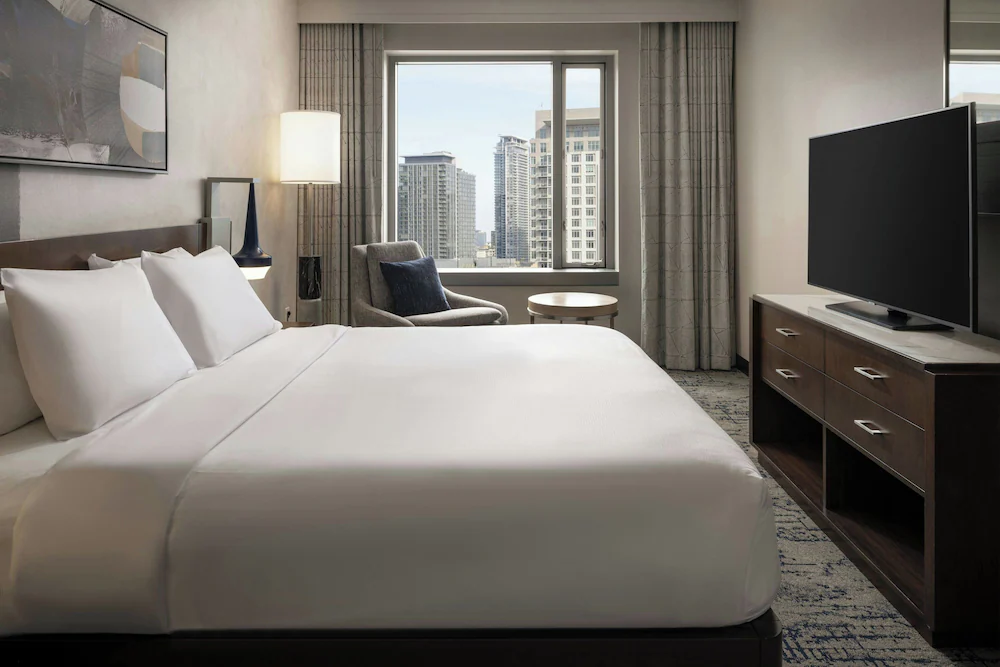 Common areas give you options beyond the suite. The fitness center covers cardio and strength sessions, and the outdoor pool offers a quick reset between calls. The lobby market keeps snacks and basics within reach. If you are rotating in and out of downtown job sites or venues, valet parking is on site and rideshare pickup is straightforward at the entrance. Pet friendly options are available in select suites when a longer relocation includes a four legged companion.