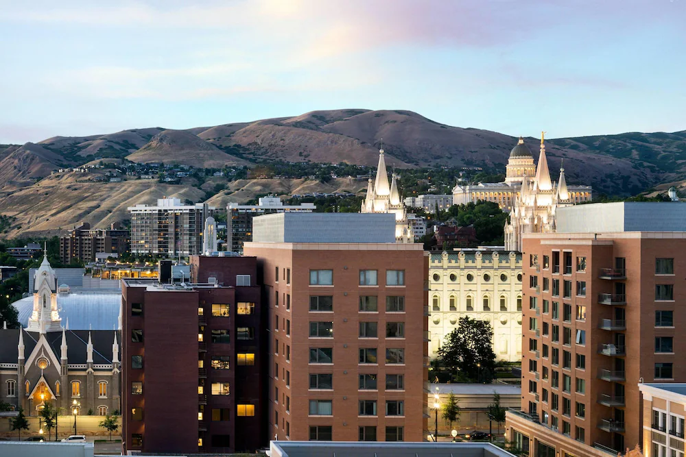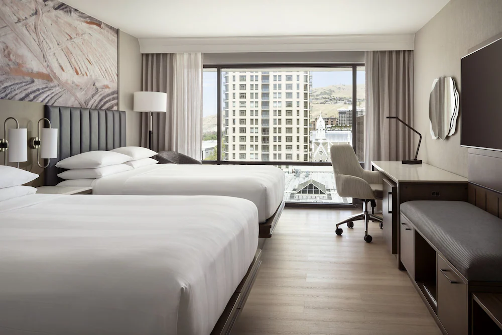 At 0.3 miles from the LDS General Conference address at 60 North Temple Street, Salt Lake Marriott Downtown at City Creek is one of the closest large-hotel options that can actually handle organized room blocks. With roughly 510 guest rooms, it is built to absorb higher demand weekends and still keep multi-room groups under one roof, which matters for wards, multi-family travel parties, choir visitors, and coordinated conference attendees arriving on different schedules.