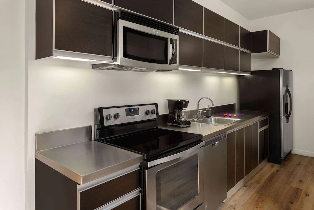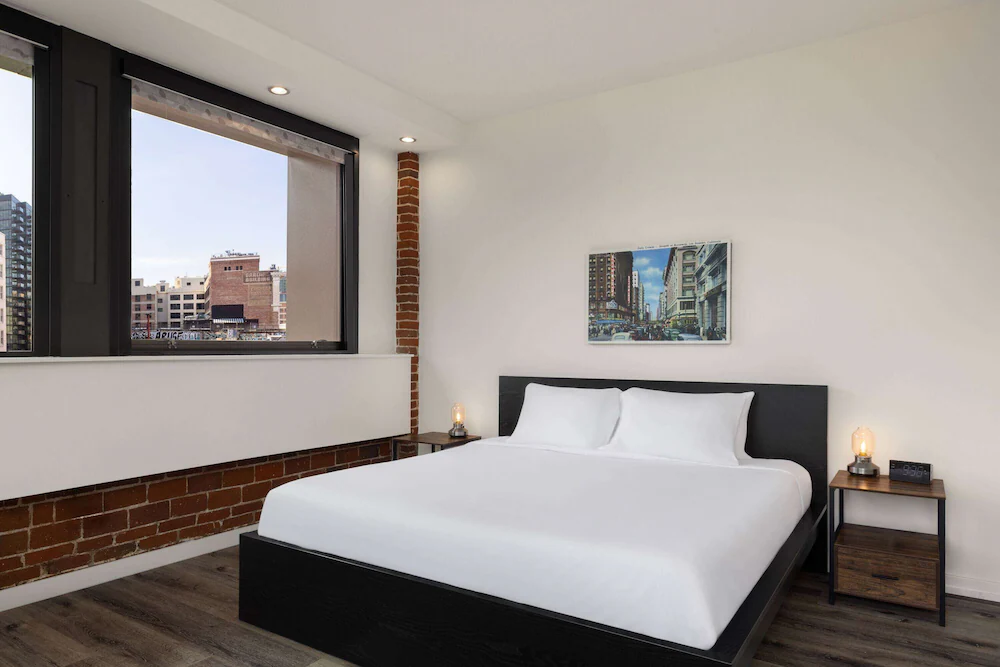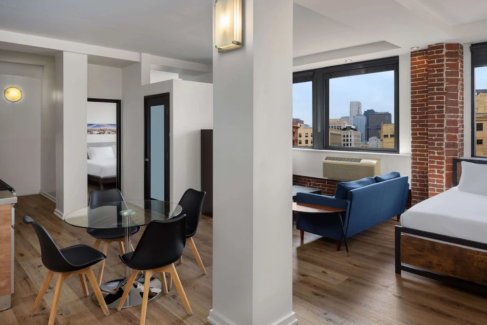 The Haas, Trademark Collection by Wyndham offers apartment-style suites in the center of Downtown Los Angeles, giving long-stay guests real space, full kitchens, and an easy walk or quick ride to L.A. LIVE, the Convention Center, and office towers across South Park and the Financial District. The historic Haas Building setting adds character, while modern in-room amenities keep multi-week routines predictable. You will find dependable Wi-Fi, practical work areas, and layouts that feel more like a city flat than a standard room, which makes long project days and rotating schedules easier to manage.