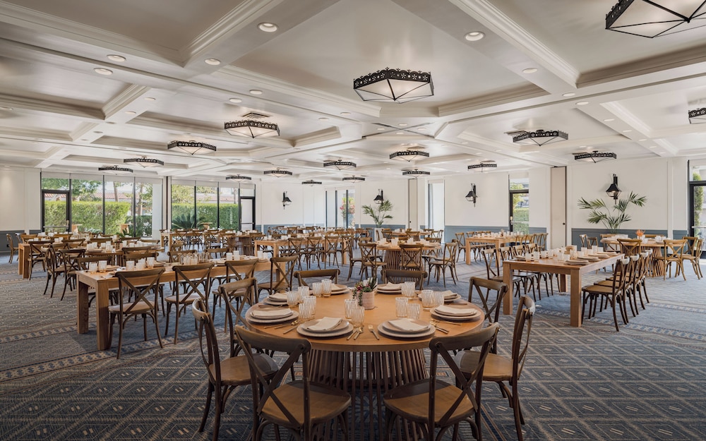 The Scott has more than 14,500 square feet of indoor meeting space, in addition to ample outdoor event space. Total outdoor function space reaches 9,000 square feet, bringing the combined indoor and outdoor figure to over 23,000 square feet. The property offers 14,500 sq. ft. of indoor function space alongside 8,500 sq. ft. of outdoor event space, with 14 distinctive meeting rooms ranging from expansive ballrooms to sunlit outdoor courtyards. The resort can host up to 350 guests for a seated dinner with a dance floor, or up to 600 guests for a standing cocktail reception.