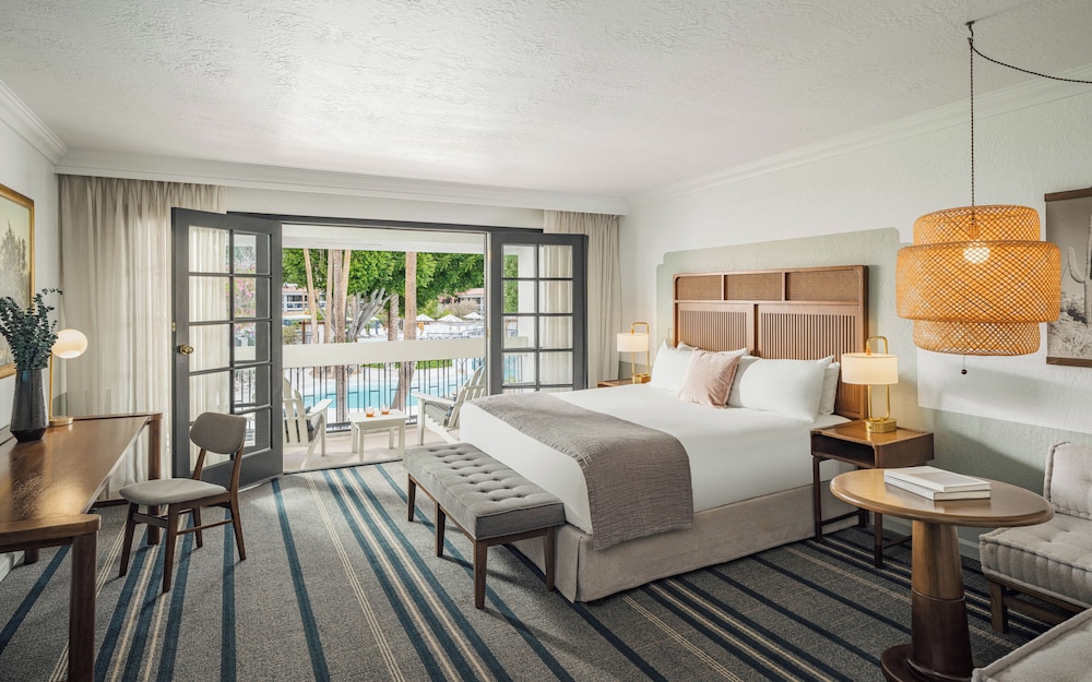 The Scott Resort & Spa is a AAA Four-Diamond boutique resort in Old Town Scottsdale with 204 guest rooms and suites spread across eight lush acres. The hotel draws its design from Havana as experienced by Ernest Hemingway, giving it a retro-tropical character that stands apart from standard convention properties. Rooms are appointed with Art Deco and mid-century elements including walnut furniture, brass fixtures, crystal whiskey glasses, and Raffia chandeliers, and every room includes plush bathrobes, premium spa-inspired bath amenities, a flat-screen TV, an iHome docking station, and an in-room laptop safe. The resort holds a AAA Four-Diamond rating and has earned recognition including Best Hotel by U.S. News and World Report and Best Renovation by Northstar Meetings Group.