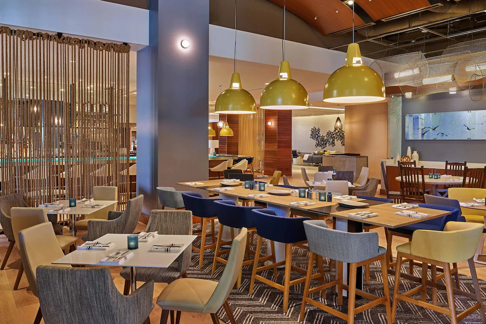 The interior atmosphere centers on a theme of modern renewal, utilizing stone and wood accents alongside a neutral color palette to create an grounding environment. Upon entering the lobby, guests find a spacious, multi-level common area that facilitates professional gatherings and casual networking. The grand staircase leads to an expansive foyer, which acts as a secondary lounge for those attending sessions in the hotel’s substantial meeting wing. Dining areas, including the Bronze Bird restaurant and the Ingredients Grab ‘N’ Go café, are positioned for easy access, ensuring that groups can move quickly from breakfast to their scheduled activities without bottlenecking.