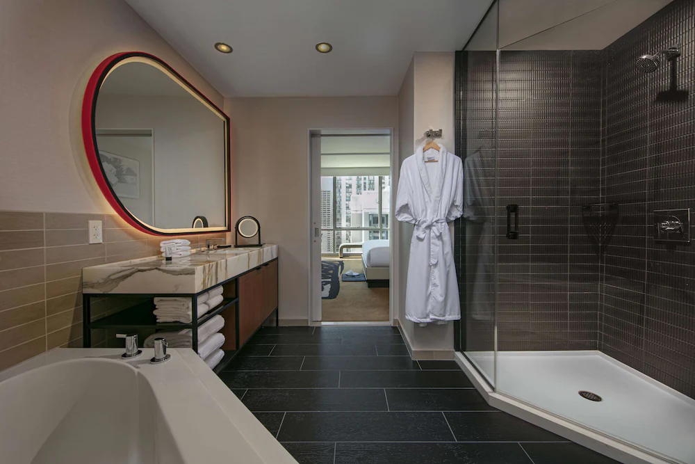 Accommodations at theWit are designed to be chic and contemporary, with a focus on bold aesthetics and city views. The rooms feature floor to ceiling windows that offer dramatic perspectives of the Chicago River, State Street, or the iconic Chicago Theatre marquee. The decor utilizes a striking color palette with dark tones and vibrant accents, creating a moody and sophisticated atmosphere.