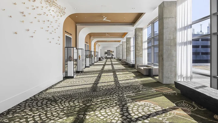 Dream Ballroom Foyer 123 features floor-to-ceiling windows and beautiful art pieces from our curated collection. It directly connects to the Dream Ballroom and accommodates up to 450 guests for receptions with hightop tables or fundraising dinners.