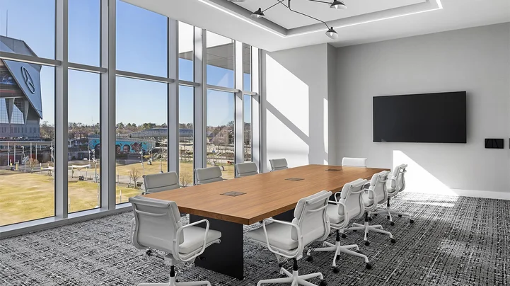 Mt. Vernon Boardroom offers a refined setting for executive meetings with panoramic views of Mercedes-Benz Stadium. Located on the third floor, this boardroom accommodates up to 12 guests and features integrated technology for seamless presentations. Named in honor of Mount Vernon Baptist Church, this space provides an inspiring backdrop for strategic discussions and decision-making sessions.