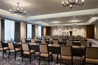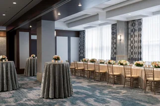 The Ballroom serves as the hotel's premier event space, accommodating up to 300 guests across 3,354 square feet. Floor-to-ceiling windows provide abundant natural light and views of the surrounding landscape. The space offers exceptional flexibility with multiple configuration options to suit any occasion, from large-scale conferences and celebrations to intimate boardroom meetings.