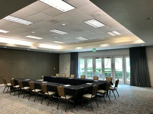 Located in the Conference Center and part of the resort’s stunning event wing, the Cannes Ballroom can function independently for small meetings or in tandem with adjoining spaces for larger programs. It’s the perfect choice for upscale receptions, executive meetings, or private dinners—offering a refined backdrop without sacrificing comfort or convenience. The Cannes room features large windows and glass doors that overlook the picturesque Matisse Lawn, filling the space with natural light and offering a seamless indoor–outdoor connection. This view adds a serene backdrop for daytime events and a dramatic glow at dusk, perfect for receptions and dinners.