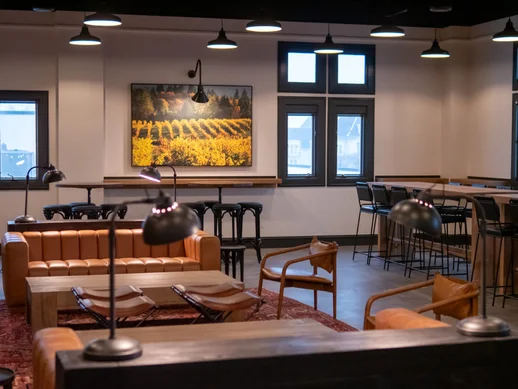 The Velvet Room creates an inviting atmosphere where industrial elements meet warm hospitality, featuring exposed ductwork paired with rich leather seating and natural wood accents. This 1,300-square-foot space seamlessly blends lounge areas with high-top tables and communal seating, offering flexible arrangements for cocktail receptions and celebratory gatherings. Multiple windows provide natural light throughout the day, while pendant fixtures create ambient evening ambiance. The space includes a striking wine display wall and artwork that adds character without overwhelming the versatile layout. With its mix of intimate seating clusters and open areas for mingling, the Velvet Room accommodates up to 50 guests for receptions where conversation flows as freely as the wine.