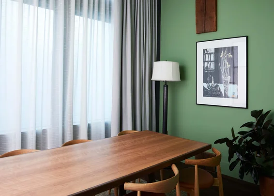 10 person meeting room with plenty of natural lighting. Includes big screen TV you can plug right into with HDMI cord. Hox Box is filled with notepads, pens, pencils and other office supplies. White boards or flip charts available at no charge upon request. Access to The Pantry which includes all day coffee/tea/sodas and soda water. Light breakfast and PM snacks are also included.