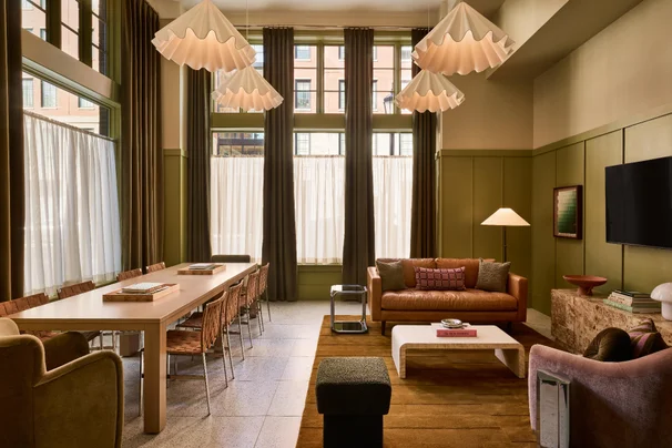 Modern, well-lit , first floor space located off the living room of The Ann. HDMI cable and TV included in all pricing. Conference table for 10 and soft seating for 5.