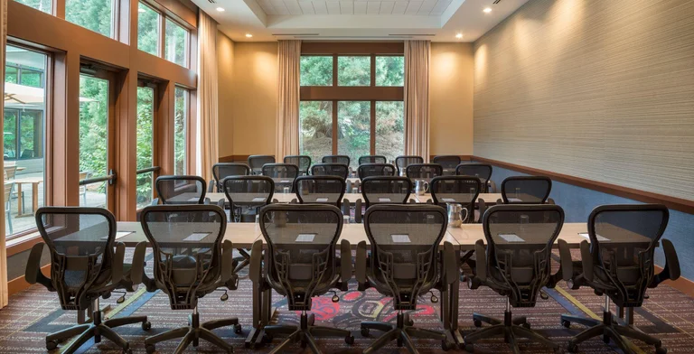 Baker offers a versatile meeting environment with abundant natural light from expansive windows overlooking lush greenery. This adaptable space accommodates up to 40 guests and transforms seamlessly between intimate boardroom sessions and dynamic presentations, making it ideal for focused corporate gatherings and productive workshops.