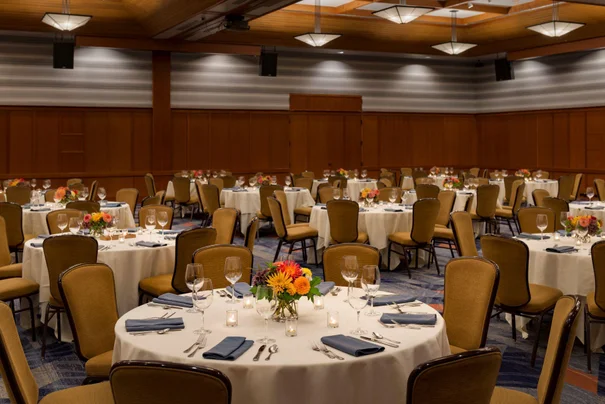 The Cascade Locks Ballroom is the hotel's largest event space, accommodating up to 400 guests for your most significant occasions. This pillar-free ballroom offers exceptional versatility, dividing seamlessly into two equal halves when more intimate gatherings are preferred. The space transforms effortlessly from grand banquet celebrations to corporate conferences and theatrical presentations.